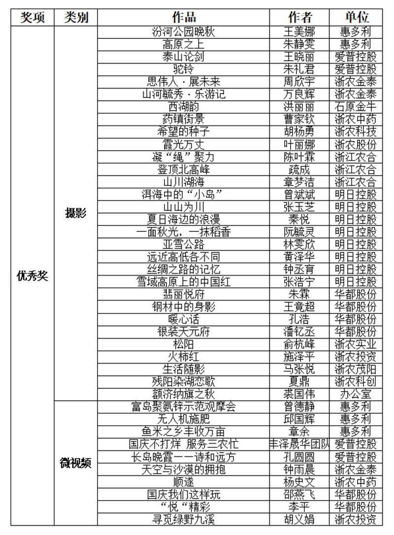 經(jīng)集團(tuán)內(nèi)外評委評議,明日控股崔志浩的單幅作品《古代和現(xiàn)代的碰撞》、明日控股邱旸歆的組照作品《山河遠(yuǎn)闊 國泰民安》、浙農(nóng)科技符銀川的組照作品《沃野金麥繪豐圖:農(nóng)業(yè)夢之卷》獲攝影組一等獎,明日控股俞濤《滄海一粟》等6件作品獲二等獎,惠多利韋揚(yáng)《晚秋》等9件作品獲三等獎;浙農(nóng)農(nóng)業(yè)甘良的作品《慶祝祖國母親生日快樂!》獲微視頻組一等獎,浙農(nóng)股份申琪婧《浙農(nóng)青年采菊活動》、明日控股俞燁敏《最美風(fēng)景》獲二等獎,金誠汽車陳練翠《信仰的顏色是紅色》、華通商貿(mào)陸嘉琦《山不見我,我自去見山》、明日控股蔡佳楠《山清水秀-大洋塢水庫》等3件作品獲三等獎。