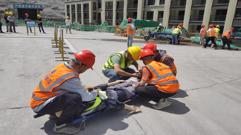 本次演練模擬橫店受臺風影響持續(xù)暴雨,項目三期1#地庫施工區(qū)域涌進大量雨水,積水深度達到40CM,施工人員被困地下室施工現(xiàn)場。在發(fā)現(xiàn)“險情”后,演練啟動二級應急響應機制,圍繞集結(jié)待命、巡查預警、疏散搶險、人員轉(zhuǎn)移等科目開展實戰(zhàn)演練。演練分工明確,各環(huán)節(jié)協(xié)調(diào)有序。面對“險情”,物資組將防汛物資快速運至現(xiàn)場,搶險組進入現(xiàn)場后檢查電源、照明線路架空,搶險、救援組進行了沙袋封堵、應急抽水、人員疏散等科目演練,參演人員快速反應、迅速處置,受傷人員按照應急預案及時轉(zhuǎn)移并臨時救護,整個過程表現(xiàn)出良好的團隊合作精神。