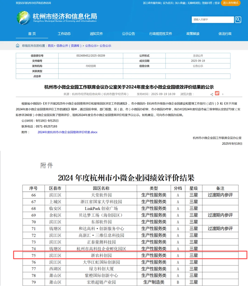 近日,杭州市小微企業(yè)園工作聯(lián)席會(huì)議辦公室公布2024年度小微企業(yè)園績(jī)效評(píng)價(jià)結(jié)果,浙農(nóng)科創(chuàng)園再次獲得三星A檔績(jī)效評(píng)價(jià)。